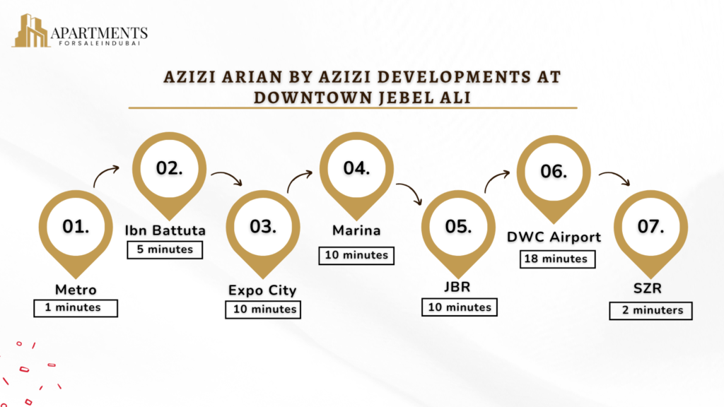 Azizi Arian is positioned in Downtown Jebel Ali with direct access to major transport links. Therefore, residents can move around Dubai easily for work, leisure, and everyday commuting needs.